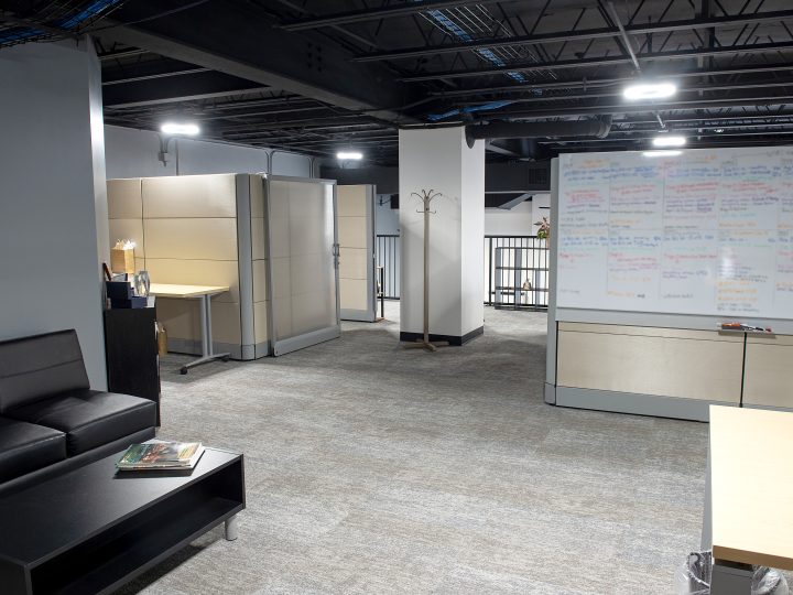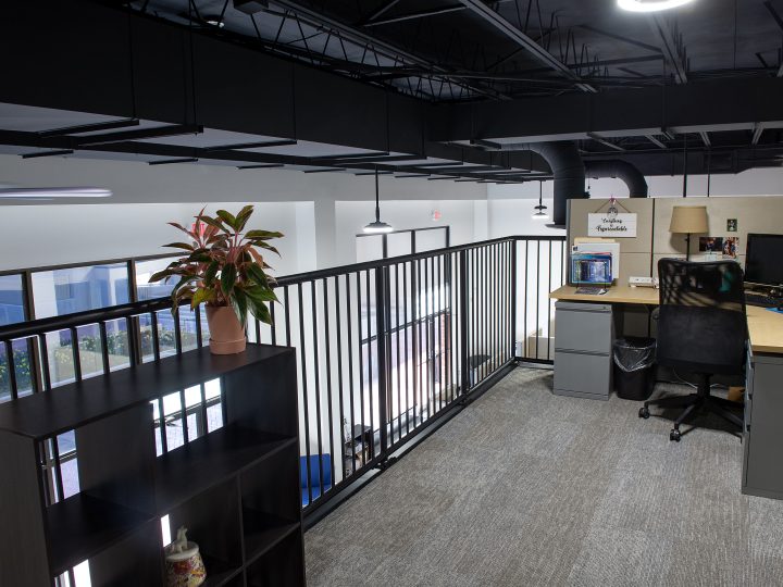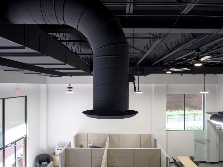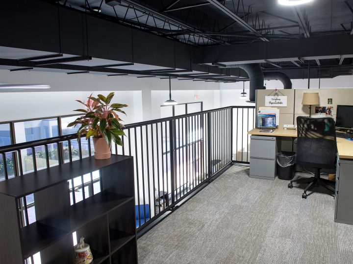 To make the best use of the existing facility, the project team created a mezzanine to house additional working areas. This addition necessitated the removal of the existing drop ceiling, which created an exposed industrial look throughout the space. To ensure that there would be sufficient working space for GRCA employees, most of the duct work was relocated to an adjacent hallway, freeing up significant ceiling space. The exposed ceilings and remaining systems were painted black to add to the overall aesthetic of the office.