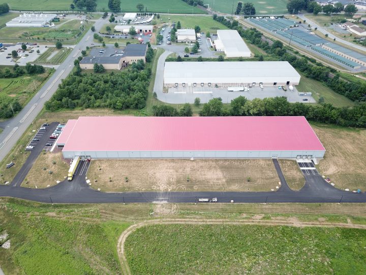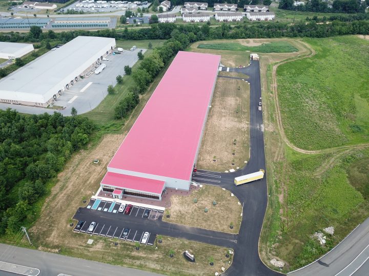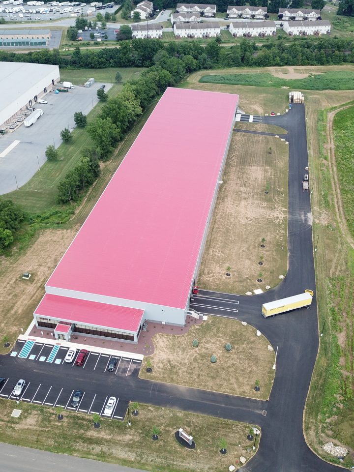 The owner wanted this facility to have a more elevated look than most warehouses. To accomplish this, Burkey installed owner-provided panels on the facility's exterior and floor-to-ceiling storefront windows in the office section. The building also features a unique red roof.
